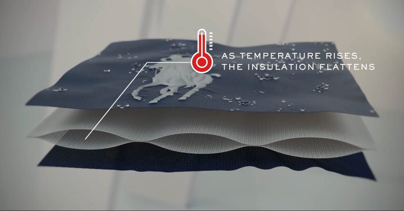 Ralph Lauren holds a patent for “intelligent insulation”, which is a temperature-responsive fabric system that adapts to the environment you’re in (or moving through). Say you’re moving from indoors to outdoors a lot – you wouldn’t need to change coats. The technology is really cool: